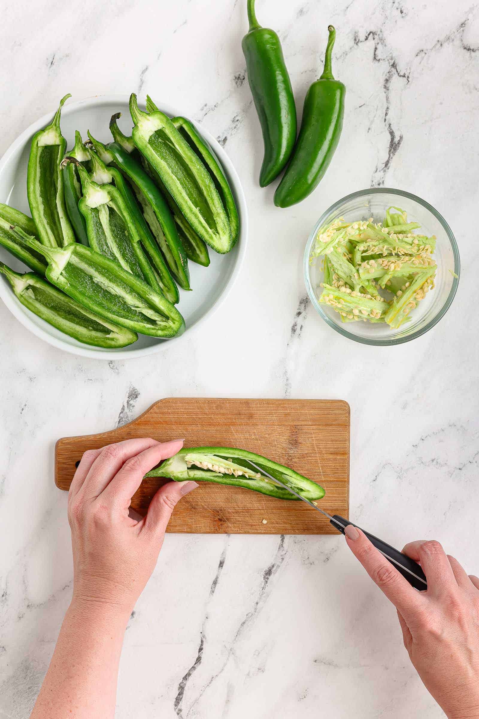 - Step 1: Prep the Jalapeños: Slice each jalapeño in half lengthwise. Scoop out the seeds and membranes (leave a few for extra heat if you like it spicy).