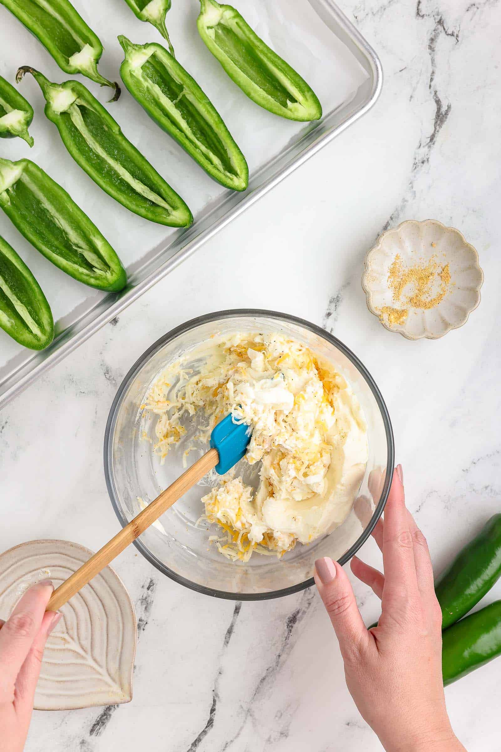 - Step 3: Fill the Jalapeños: Spoon the cheese mixture into each jalapeño half, spreading evenly but not overfilling.