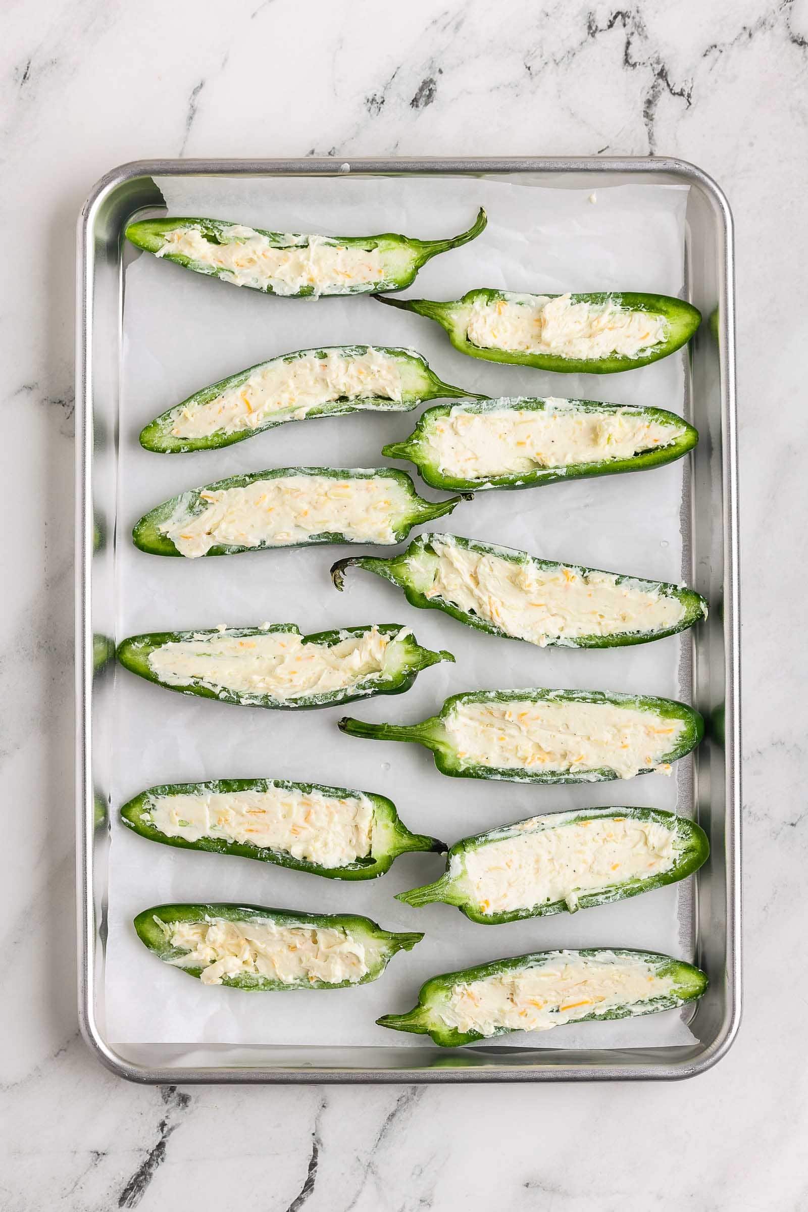 - Spoon the cheese mixture into each jalapeño half, spreading evenly but not overfilling.