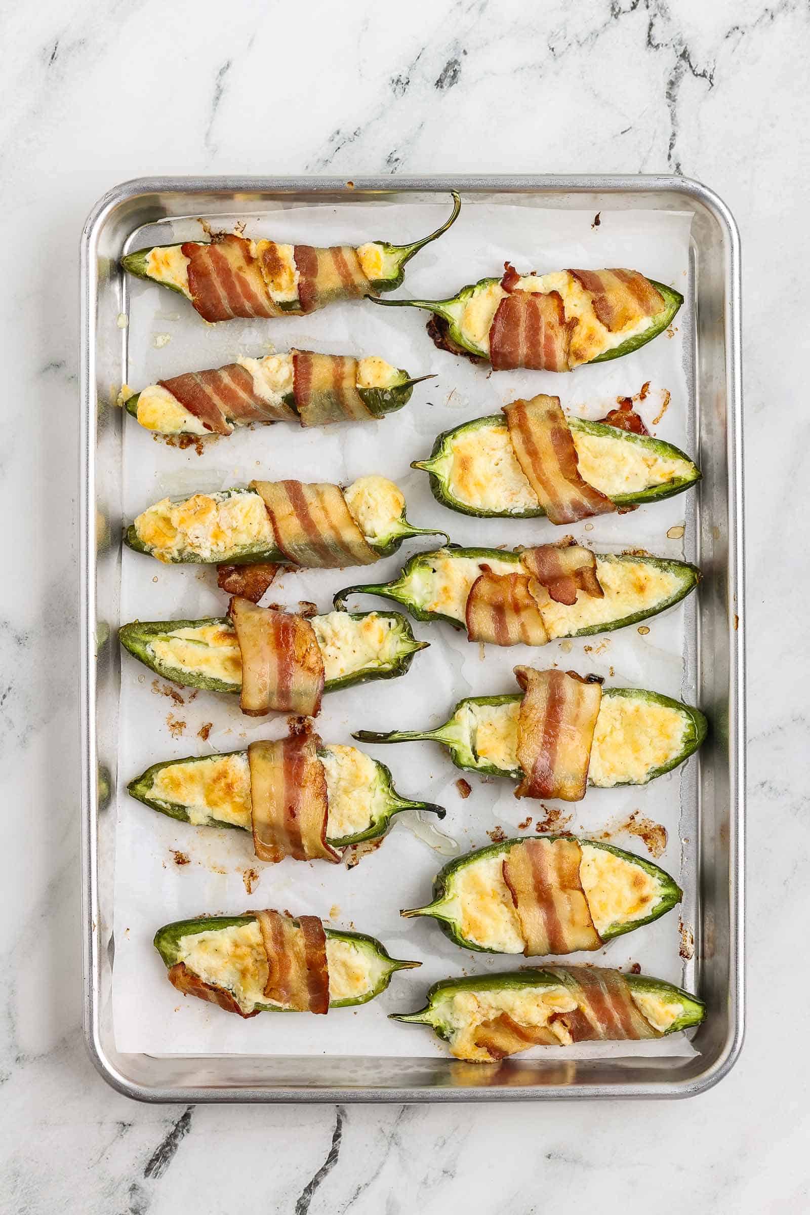 - Oven method: Preheat oven to 400°F. Place poppers on a baking sheet lined with foil or parchment paper. Bake 20–25 minutes until bacon is crisp and cheese is bubbly.