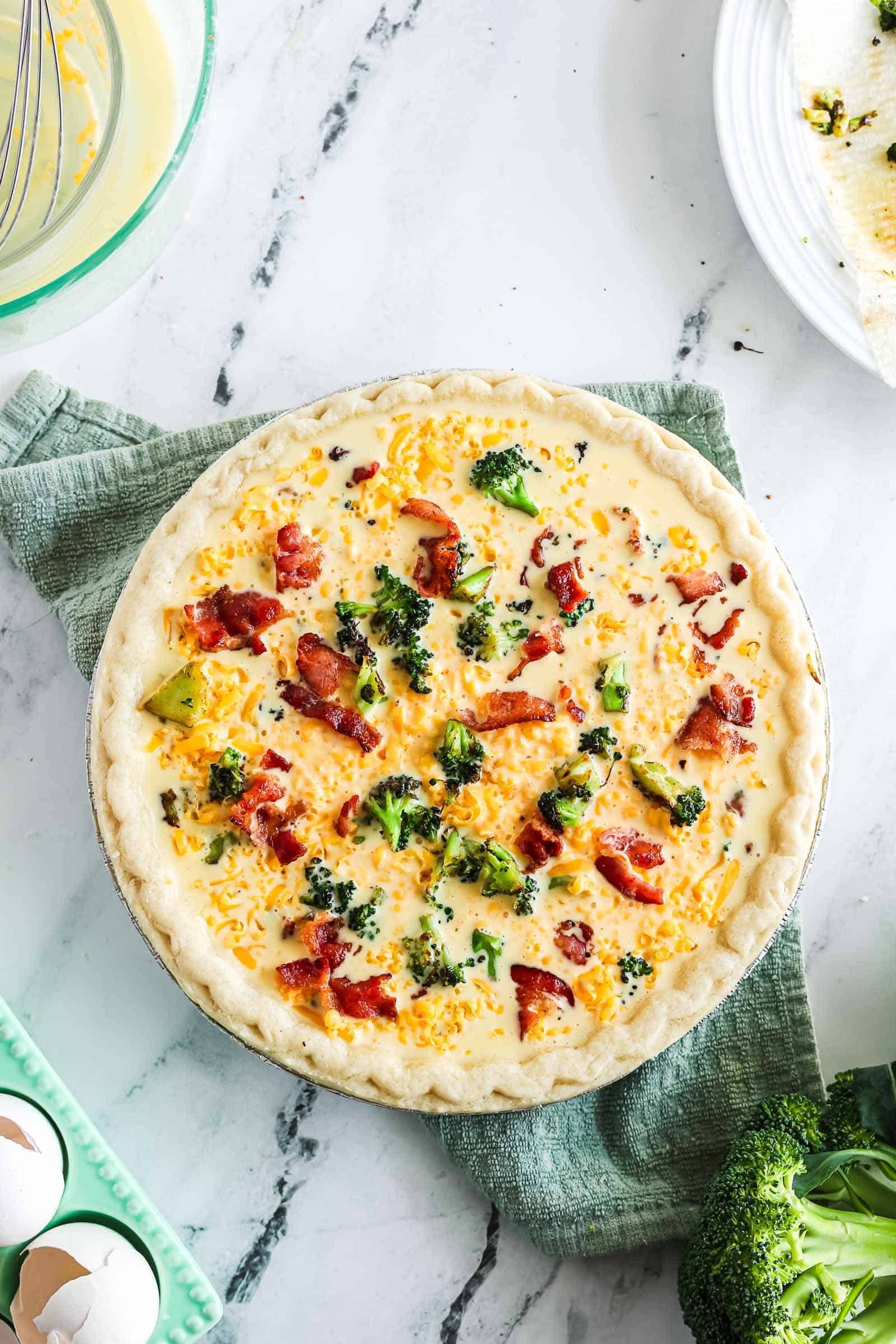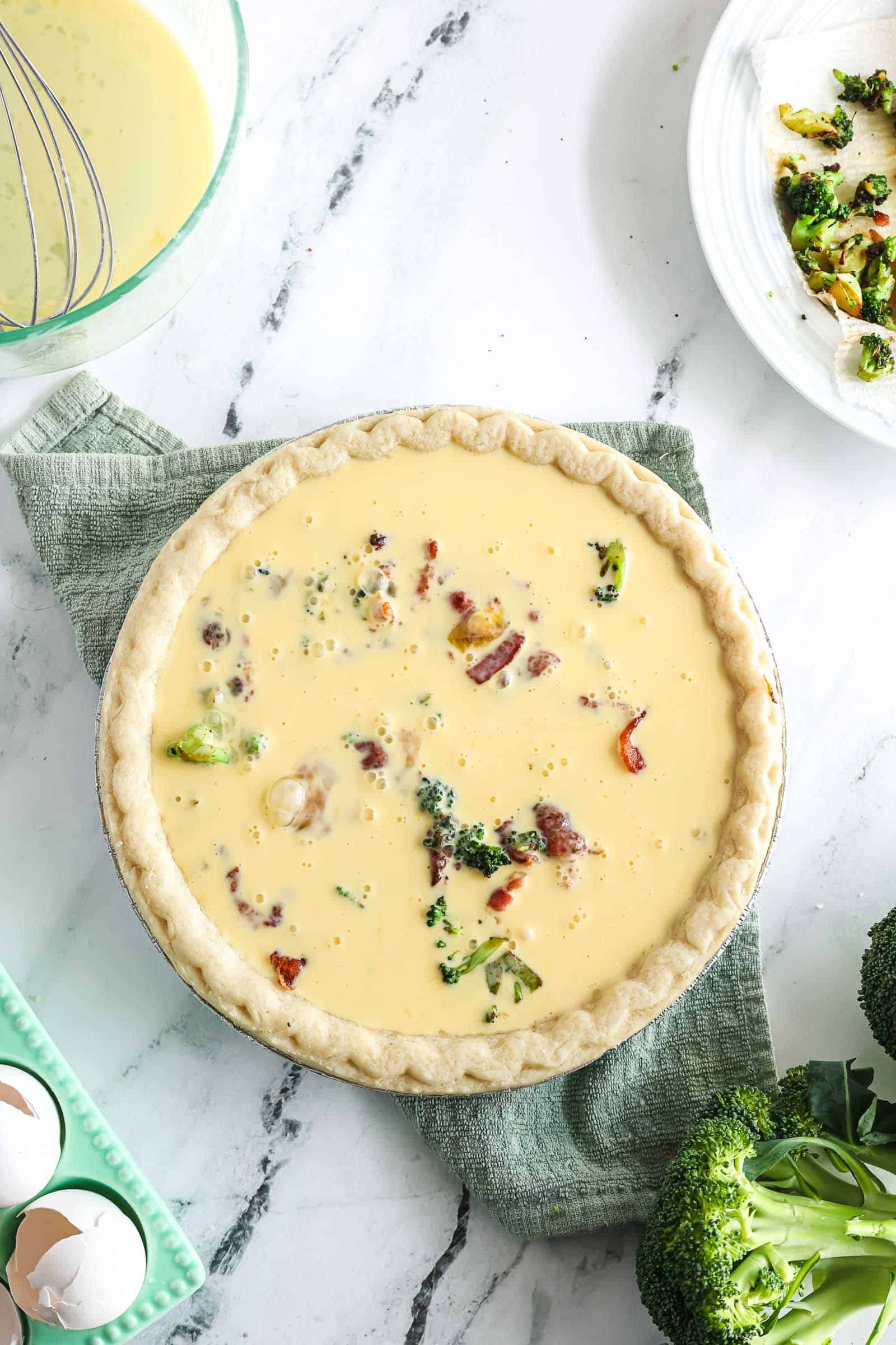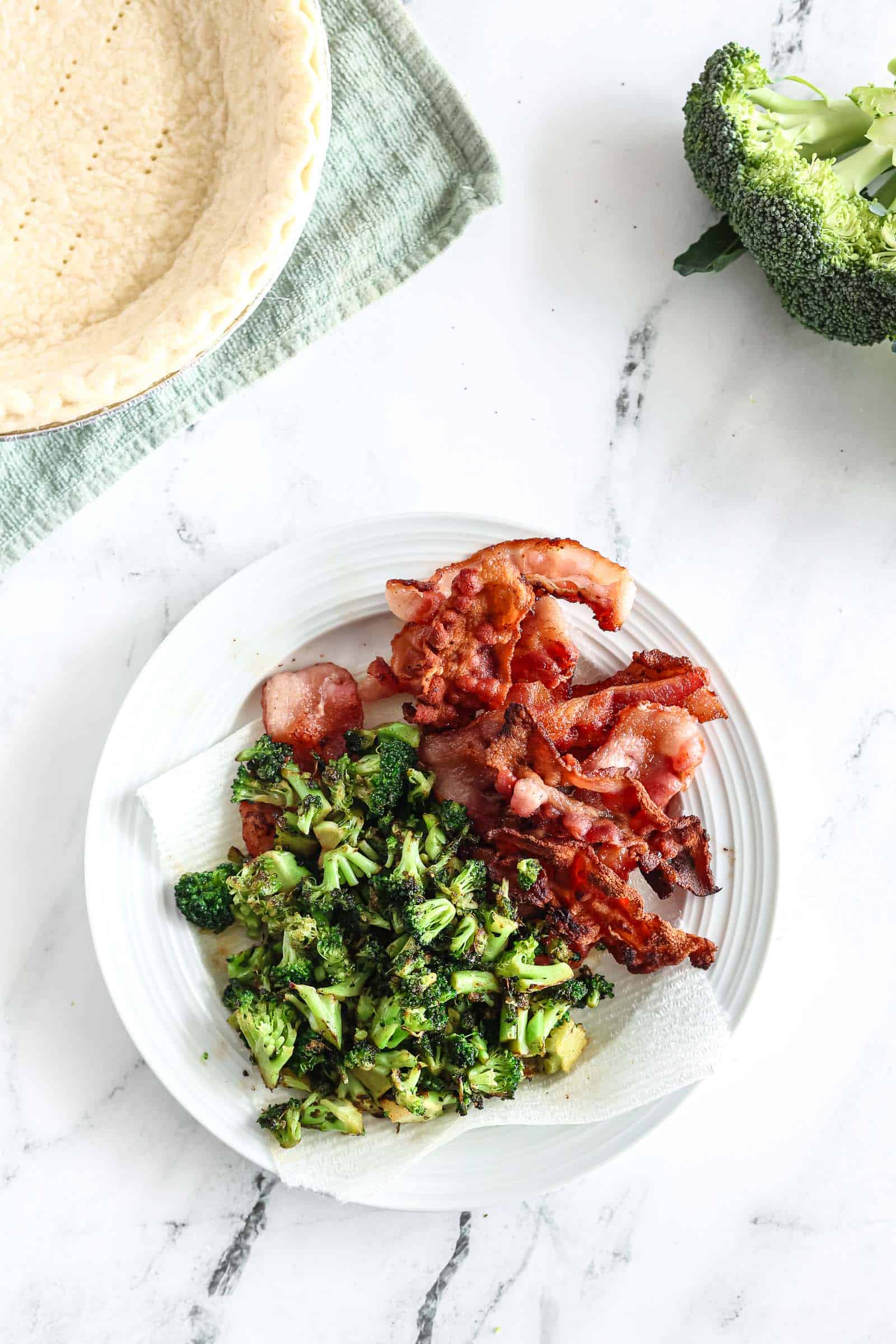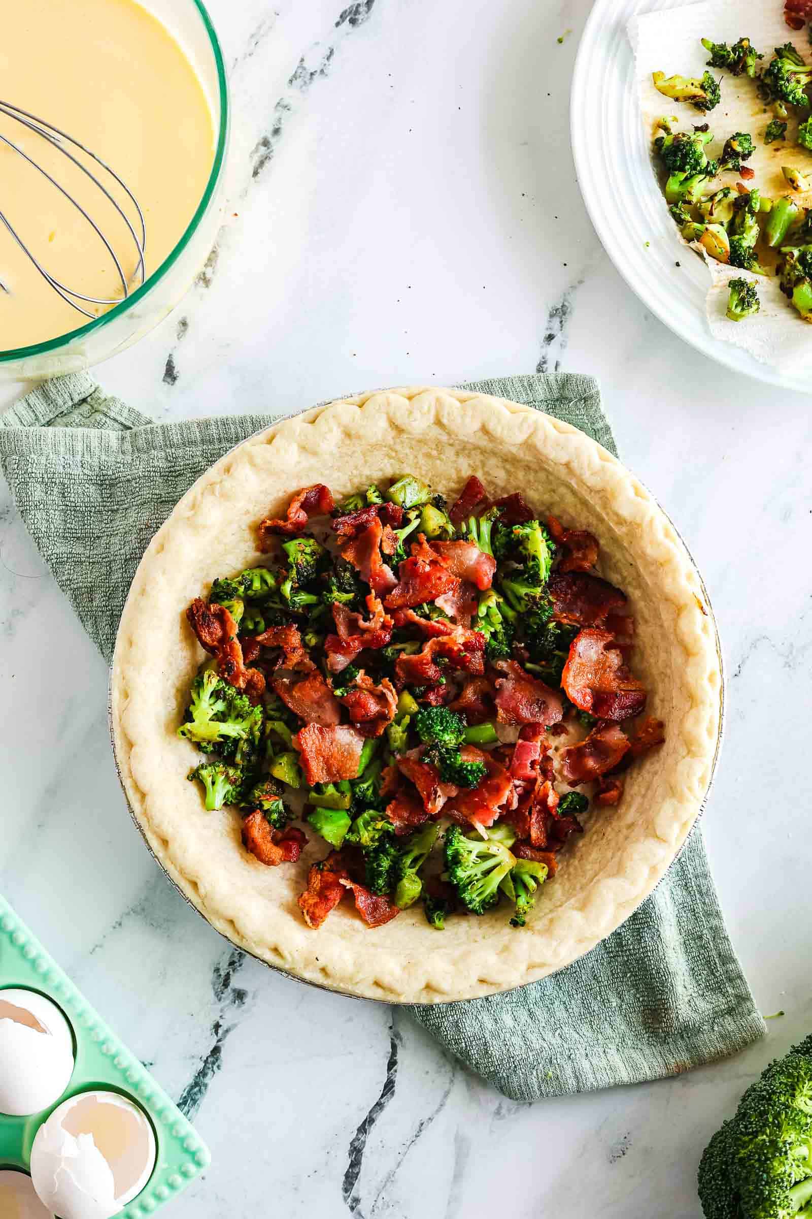 - Step 7: Add the cooked bacon and broccoli to the pie crust.