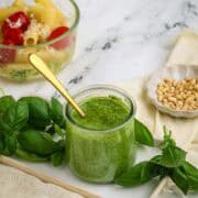 If you're craving something fresh, vibrant and full of flavor, this classic basil pesto is just what you need. Made with just a handful of simple ingredients, such as fresh basil, garlic, parmesan cheese, and toasted pine nuts, this homemade pesto delivers exceptional flavor that you wont find in your grocery aisles. It's quick to whip up and endlessly versatile. Toss it with pasta, spread it on sandwiches or drizzle it over roasted veggies.