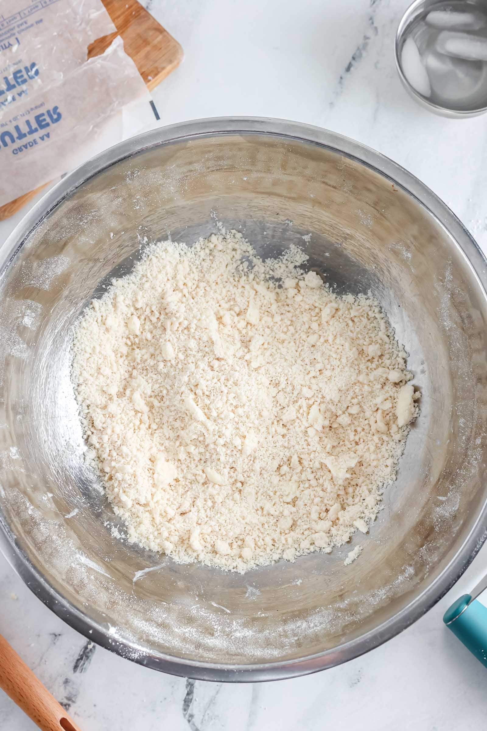 - Add the cold butter cubes, cutting them in with a pastry cutter or your fingers until the mixture resembles coarse crumbs.