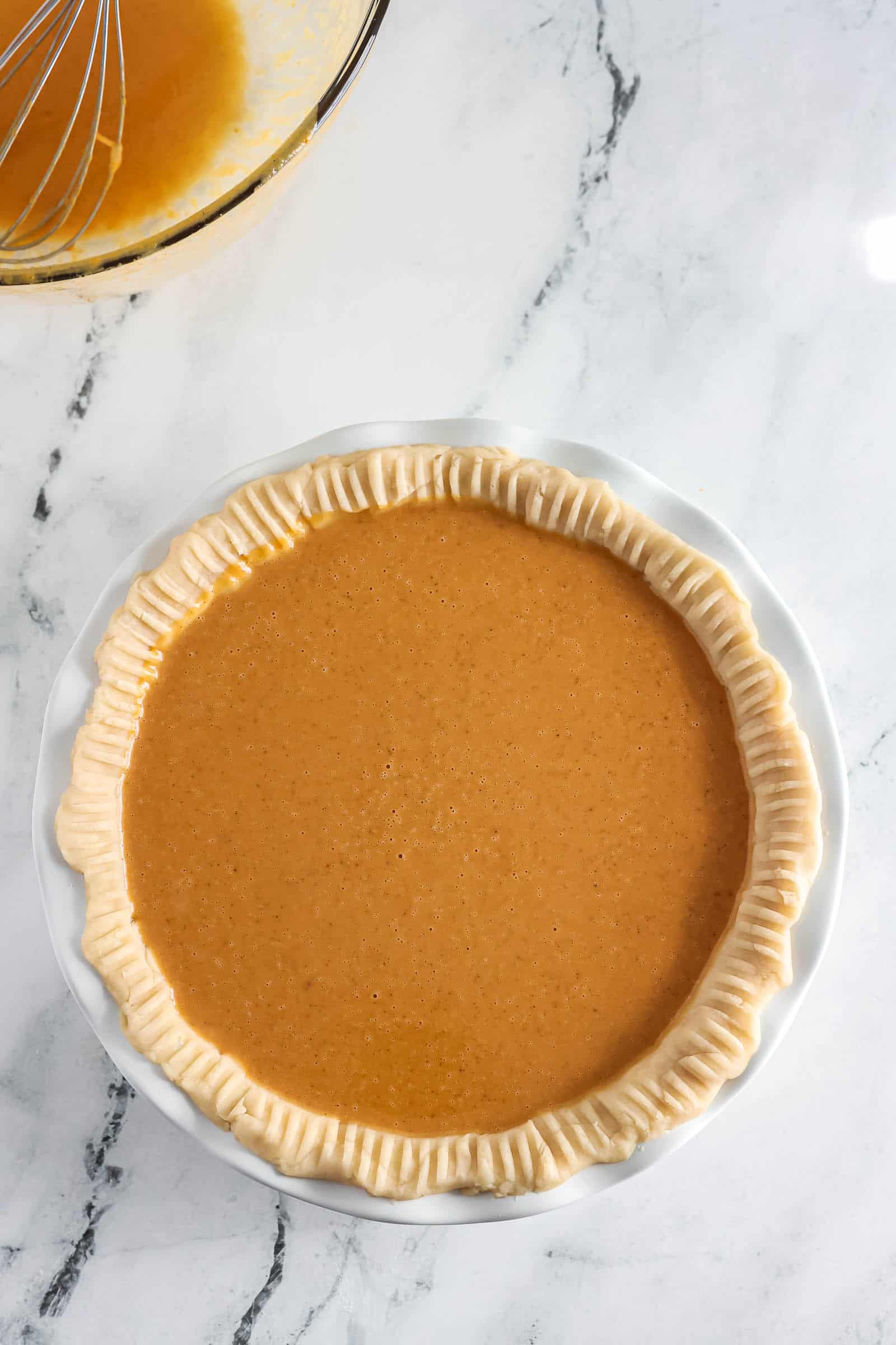 Whisk the filling until just combined. Overmixing can incorporate too much air, causing the pie to puff up in the oven and crack as it cools.