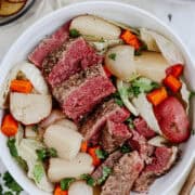 - Serve: Slice the corned beef against the grain and serve with the tender vegetables. Spoon some of the broth over everything and sprinkle with fresh parsley.