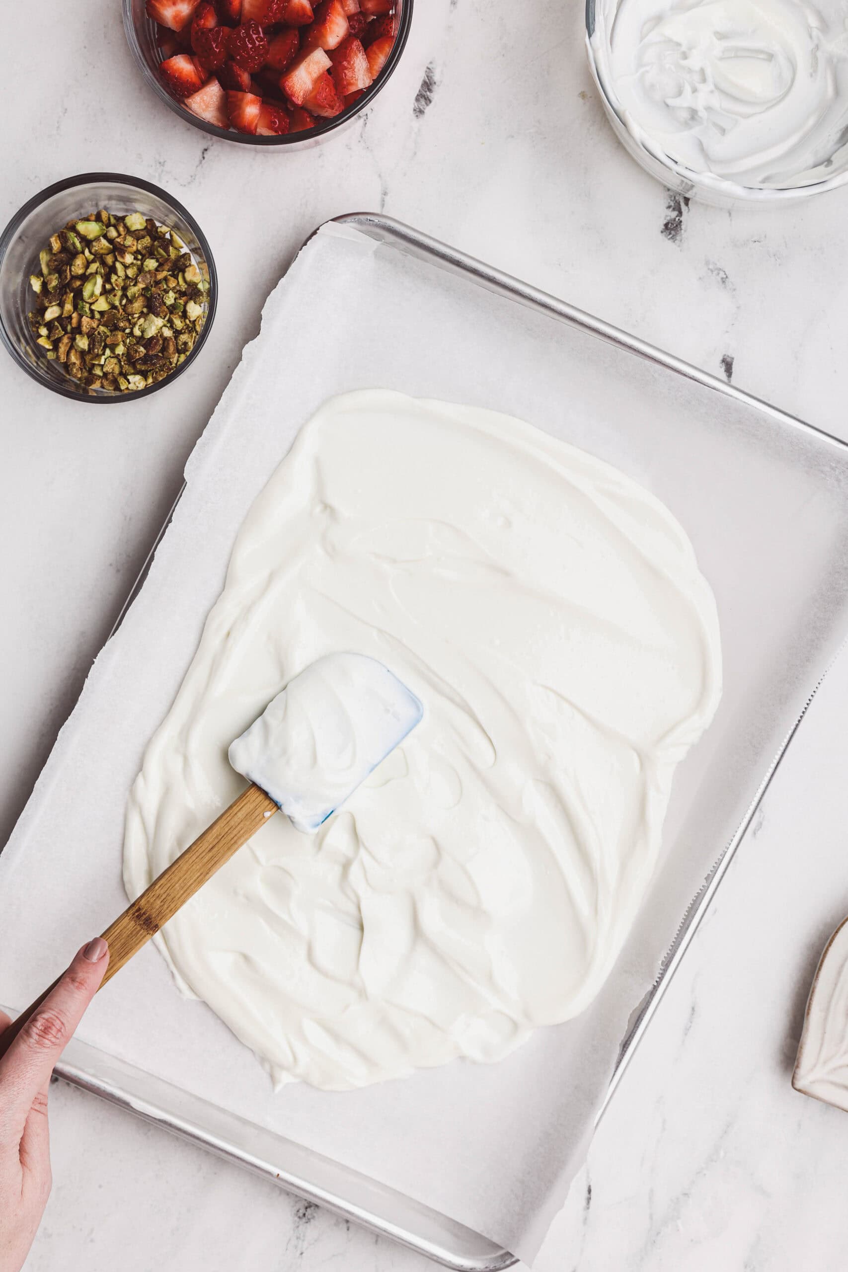 - Spread the vanilla yogurt onto the parchment in an even layer about ¼-inch thick.