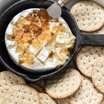Safety First: If you baked the brie cheese in a cast-iron skillet like I did, allow the skillet to cool for a few minutes or wrap a tea towel around the edges, so guest do not burn themselves while enjoying the dish.