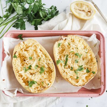 Light, flavorful, and very simple, oven-baked spaghetti squash is the perfect base for countless dishes or a delicious side dish all on its own. With a drizzle of olive oil, a hint of garlic, and fresh parsley, this recipe transforms a humble squash into a dish that’s both nourishing and satisfying.