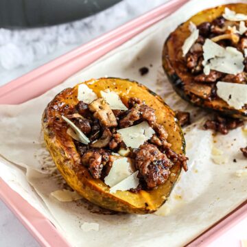Return the stuffed squash to the oven and bake for another 10–15 minutes, until the filling is golden, and the cheese is melted.