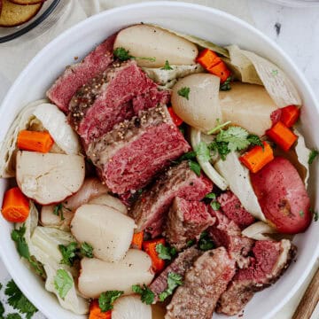 Serve: Slice the corned beef against the grain and serve with the tender vegetables. Spoon some of the broth over everything and sprinkle with fresh parsley.