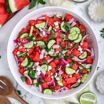 This Watermelon Salad with Feta and Mint includes crisp cucumber, tangy feta, and a squeeze of fresh lime, every bite is refreshing and vibrant as the last.